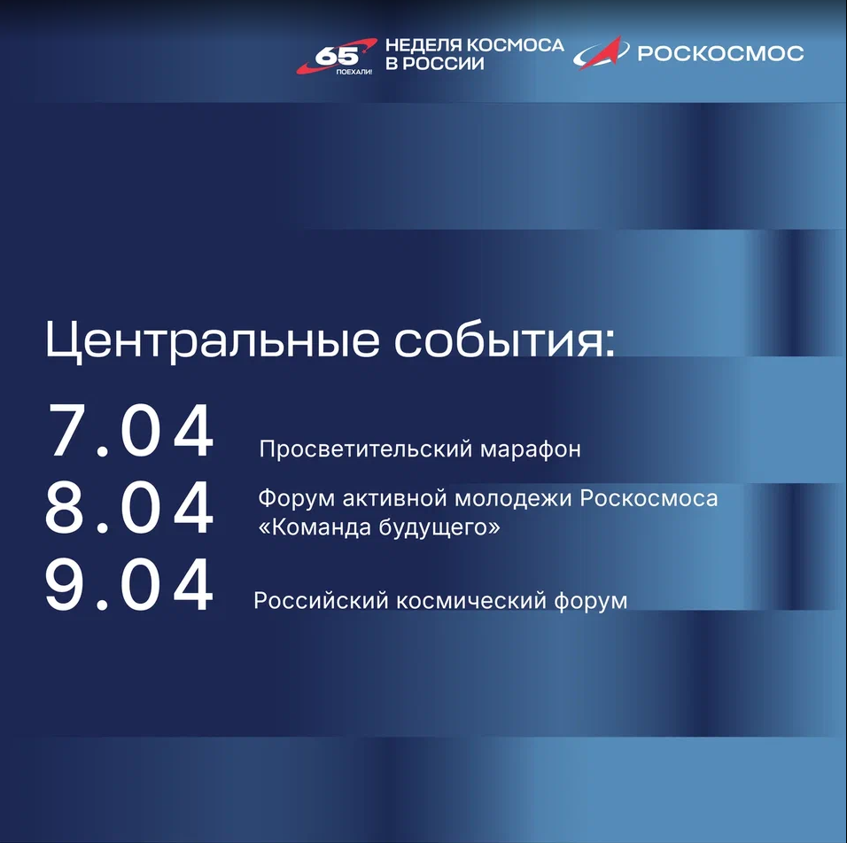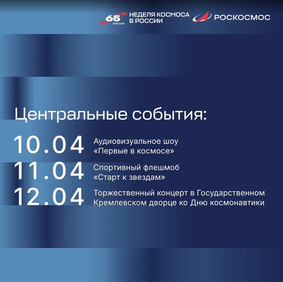 В этом году мы отмечаем эту дату с особым чувством гордости, поскольку легендарному полету Юрия Гагарина исполняется 65 лет. 29 декабря Президент России Владимир Владимирович Путин подписал Указ о проведении в Российской Федерации первой Недели космоса, приуроченной к празднованию 65-летия первого полёта человека в космос. Центральным событием станет Российский космический форум, который пройдет 9 апреля в Национальном центре «Россия». Планируется, что с 2026 года Неделя космоса в России будет проходить ежегодно 6-12 апреля.